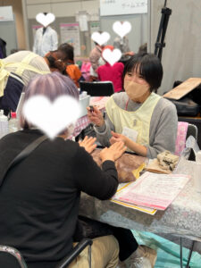 また、ブースには現在、横浜市内で訪問美容や地域イベントでネイルケアを提供し活躍している横浜校の卒業生の姿も。