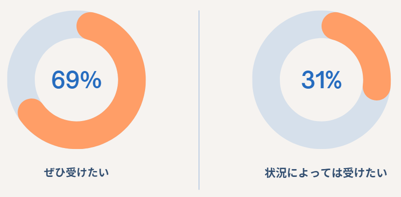 「介護美容のサービスを利用したいと思うか」という問いに対しては、**「ぜひ受けたい」「状況によっては受けたい」**と答えた人が大半で、「必要ない」との回答はゼロでした。