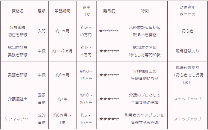 初任者研修は比較的やさしく(★1)、介護福祉士やケアマネジャーは実務経験が必要になるため中〜上級レベル(★3〜4)です。自分の経験や働き方に合わせて段階的に取得するのがポイントです。
